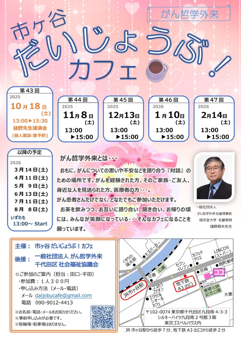 HOME > お知らせ > お知らせ 10/18だいじょうぶ!カフェ開催のお知らせ 9月 24, 2025 主の御名を賛美いたします。 東京都市ヶ谷にて、「だいじょうぶ!カフェ」を開催いたします。 第43回目となる今回は、10月18日土曜日、13時~15時30分となります。 また、今回は樋野先生をお迎えしての講演会も合わせて開催します。 会場は東京ゴスペルハウスです。JR市ヶ谷駅から徒歩7分となります。 ご興味のある皆様、ぜひお越しください。(事前申し込みが必要です) お待ちしております。 だいじょうぶ!カフェ チラシPDF Twitter Share LINE -お知らせ